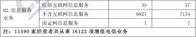 按照2015版《电信业务分类目录》中增值电信业务分类, 56847家增值电信企业合计拥有70106个许可项目。其中,35485个信息服务业务(仅限互联网信息服务),13286个信息服务业务(不含互联网信息服务),6493个国内呼叫中心业务,6234个在线数据处理与交易处理业务,4271个互联网接入服务业务(以下简称ISP),1999个互联网数据中心业务(以下简称IDC),其他业务2338个。